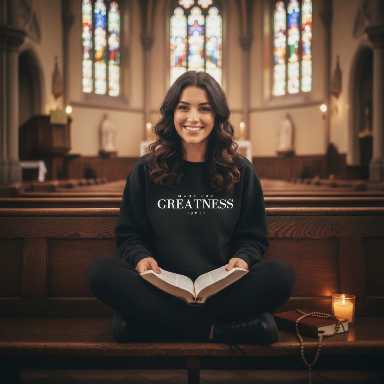 “Made for Greatness” was created for your real life — workouts, errands, mom-life, prayer time, all of it. Inspired by JP2’s reminder that greatness is holiness, not perfection, this piece keeps you modest, modern, and wrapped in truth wherever your day takes you.